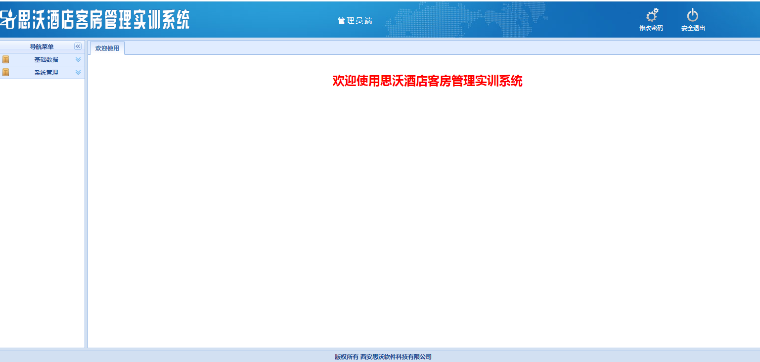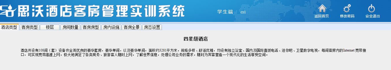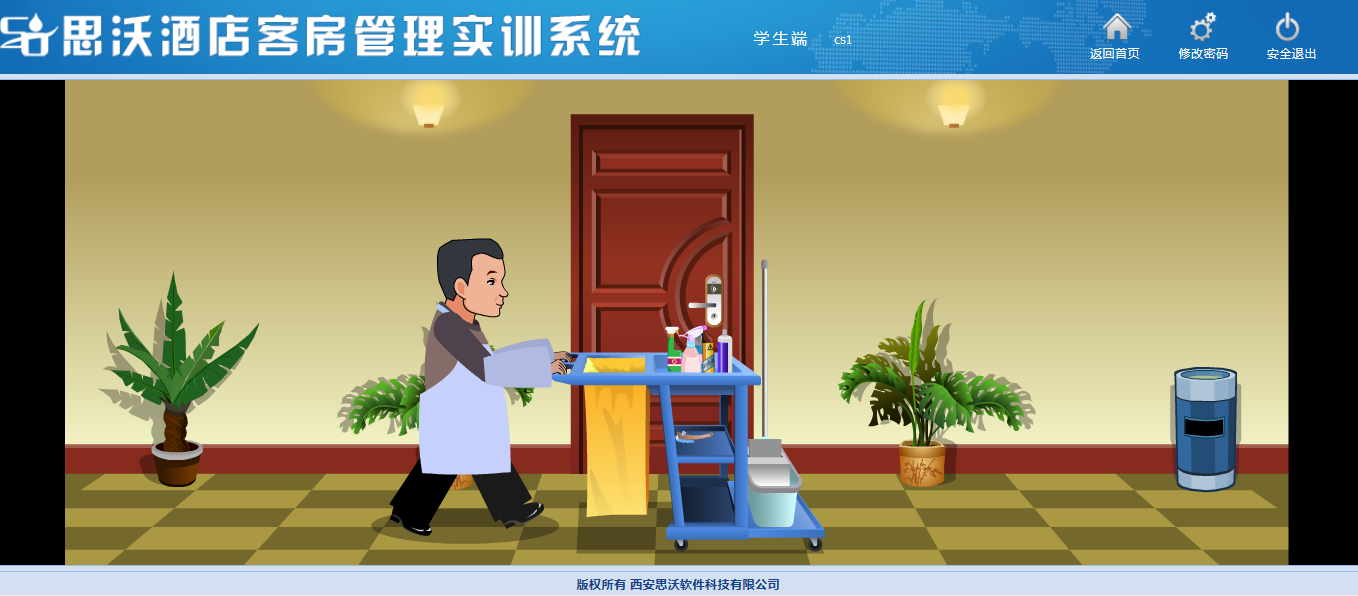 思(si)沃酒店客房(fang)(fang)管(guan)(guan)理(li)模(mo)(mo)擬(ni)實訓系統以flash動(dong)畫模(mo)(mo)擬(ni)酒店情景,學生(sheng)進入進行模(mo)(mo)擬(ni)客房(fang)(fang)管(guan)(guan)理(li)日常事務處理(li),包(bao)括客房(fang)(fang)設計、引(yin)領入住、客房(fang)(fang)查房(fang)(fang)、客房(fang)(fang)整理(li)、布草間等類(lei)型實訓。