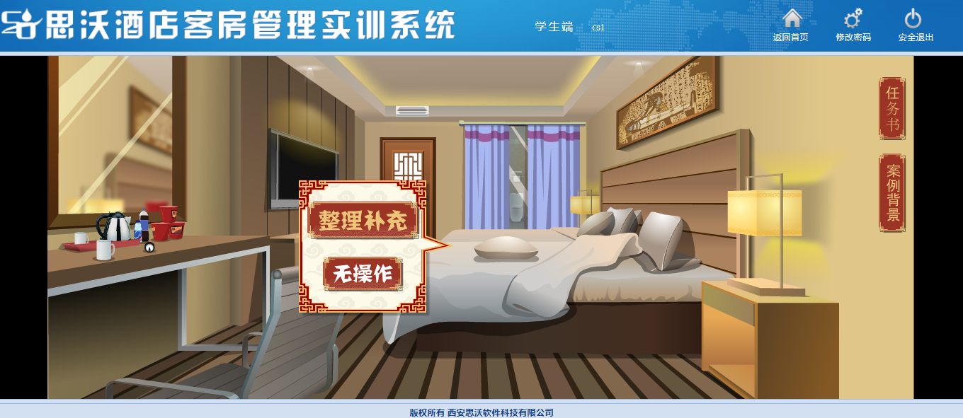 該(gai)教學軟件(jian)平(ping)臺(tai)模擬(ni)客房場(chang)景,學生(sheng)通過場(chang)景互動進行模擬(ni)操作(zuo),包含任務書、案(an)例(li)背(bei)景等(deng),學生(sheng)在操作(zuo)過程中可隨時查看進度(du)。學生(sheng)通過該(gai)教學軟件(jian)平(ping)臺(tai)的(de)虛擬(ni)場(chang)景中可對(dui)床上(shang)用(yong)品(pin)、窗簾、電(dian)器、桌椅、茶幾上(shang)的(de)消費商品(pin)、洗漱臺(tai)、馬桶、浴室等(deng)進行整(zheng)理操作(zuo)。
