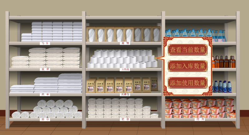 學生(sheng)端包含布(bu)草間管理場景(jing)模擬,學生(sheng)模擬工作(zuo)人(ren)員通(tong)過動畫場景(jing)互(hu)動對(dui)布(bu)草間進(jin)行管理操(cao)作(zuo)。并可查看床單(dan)、被(bei)罩、枕套、浴巾(jin)、毛巾(jin)、洗(xi)漱包、洗(xi)發(fa)水等消耗(hao)物品的庫存數量,并判斷是(shi)否補充(chong)。
