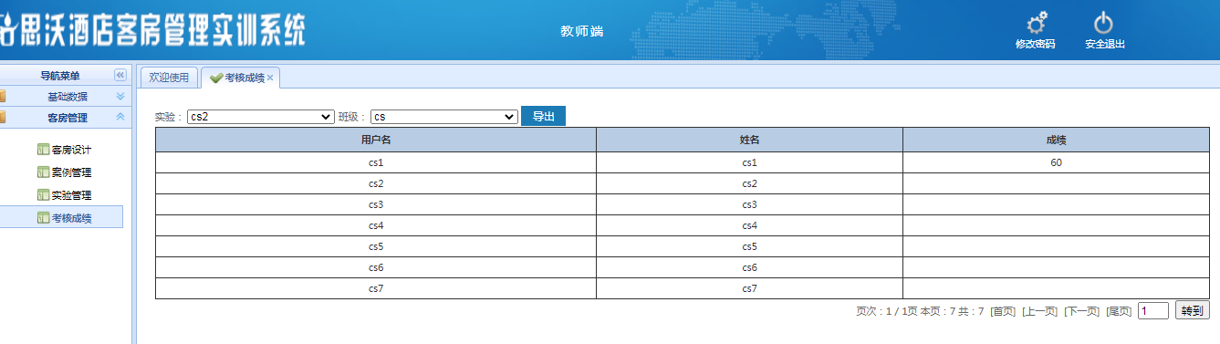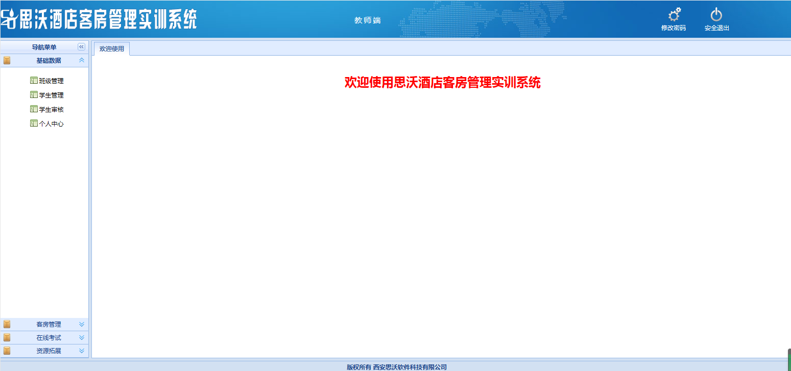 教(jiao)師登陸界面:基礎數據、客房管理,在(zai)線(xian)考(kao)試,資(zi)源拓展每個大模塊(kuai)下分別有(you)相應的子模塊(kuai)。