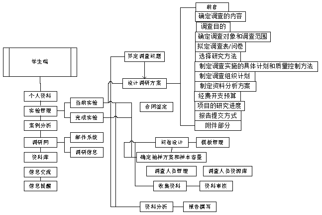 在(zai)學生端系統,學生根據教師設置的(de)(de)實驗環境確定調(diao)(diao)研(yan)課(ke)題,按步(bu)驟完(wan)成市場調(diao)(diao)研(yan)設計(ji)方(fang)案(an)、調(diao)(diao)查(cha)(cha)問卷,確定調(diao)(diao)查(cha)(cha)人員(yuan),收集及(ji)(ji)分析調(diao)(diao)研(yan)資(zi)料,撰寫(xie)調(diao)(diao)研(yan)報告。完(wan)成教師布(bu)置的(de)(de)在(zai)線作(zuo)業(ye)及(ji)(ji)案(an)例分析。系統提供一個(ge)市場調(diao)(diao)研(yan)網(wang)站,學生可以把設計(ji)的(de)(de)調(diao)(diao)查(cha)(cha)問卷在(zai)這里進行發布(bu)以收集資(zi)料,或(huo)通過電子郵(you)件方(fang)式向(xiang)參加本(ben)次實驗的(de)(de)本(ben)班其它同學,發送問卷郵(you)件以收集資(zi)料。系統界面設計(ji)美觀(guan)形象,將復雜的(de)(de)功能配以人性化的(de)(de)操作(zuo)步(bu)驟設計(ji),能盡快幫助用(yong)戶掌握其方(fang)法及(ji)(ji)步(bu)驟