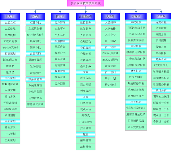 思(si)沃會(hui)(hui)展(zhan)(zhan)(zhan)營銷模(mo)擬(ni)實(shi)訓(xun)系統以(yi)模(mo)擬(ni)會(hui)(hui)展(zhan)(zhan)(zhan)公(gong)司的(de)策劃部(bu)、外(wai)聯部(bu)、招商(shang)(shang)部(bu)、會(hui)(hui)展(zhan)(zhan)(zhan)服(fu)(fu)務(wu)(wu)部(bu)、人(ren)事部(bu)、財務(wu)(wu)部(bu)以(yi)及總(zong)經(jing)辦7大業務(wu)(wu)部(bu)門為(wei)(wei)基礎而展(zhan)(zhan)(zhan)開實(shi)驗(yan)操(cao)作的(de)。該教學(xue)(xue)平臺軟件業務(wu)(wu)內容包(bao)括了(le):項(xiang)(xiang)目上報審批、項(xiang)(xiang)目的(de)策劃安排、服(fu)(fu)務(wu)(wu)商(shang)(shang)管理(li)(li)(li)、人(ren)事招聘與管理(li)(li)(li)、會(hui)(hui)展(zhan)(zhan)(zhan)的(de)現(xian)場服(fu)(fu)務(wu)(wu)與合同(tong)管理(li)(li)(li)等(deng)等(deng),讓學(xue)(xue)生(sheng)通過實(shi)驗(yan)感受會(hui)(hui)展(zhan)(zhan)(zhan)項(xiang)(xiang)目的(de)系統化管理(li)(li)(li)流程與業務(wu)(wu)操(cao)作內容,不但(dan)能(neng)夠(gou)了(le)解會(hui)(hui)展(zhan)(zhan)(zhan)項(xiang)(xiang)目從立項(xiang)(xiang)審批到策劃、宣傳(chuan)、招展(zhan)(zhan)(zhan)招商(shang)(shang)、現(xian)場服(fu)(fu)務(wu)(wu)以(yi)及會(hui)(hui)后總(zong)結各(ge)個環節(jie)的(de)業務(wu)(wu),同(tong)時還可以(yi)掌握(wo)各(ge)種(zhong)文案的(de)寫作技巧,從而讓學(xue)(xue)生(sheng)真正的(de)理(li)(li)(li)解并掌握(wo)會(hui)(hui)展(zhan)(zhan)(zhan)這一行業的(de)各(ge)種(zhong)知(zhi)識與業務(wu)(wu)要求。為(wei)(wei)學(xue)(xue)生(sheng)以(yi)后的(de)工(gong)作、學(xue)(xue)習提供了(le)一個實(shi)戰演(yan)練的(de)實(shi)訓(xun)平臺,增強了(le)學(xue)(xue)生(sheng)進入工(gong)作崗位后的(de)實(shi)力。