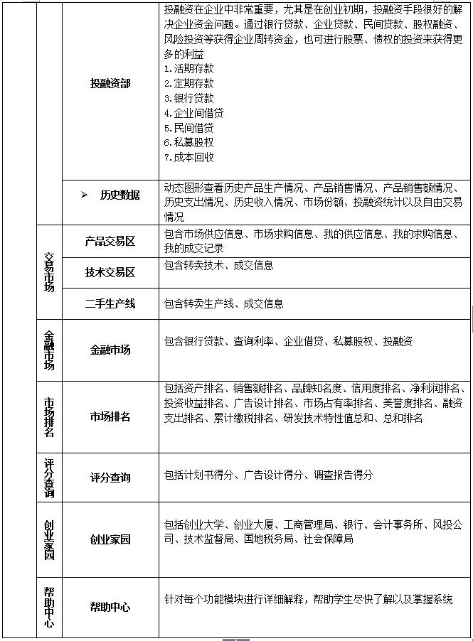 4、企(qi)(qi)業投融(rong)資管理(li):系統必須含有(you)投融(rong)資模(mo)塊(kuai)(kuai),了解操作企(qi)(qi)業的(de)基本投資和融(rong)資手段,模(mo)塊(kuai)(kuai)包括:銀(yin)行(xing)存款、銀(yin)行(xing)貸(dai)款、企(qi)(qi)業間(jian)借貸(dai)、民間(jian)借貸(dai)、私(si)幕股權(quan)。另外還含有(you)風(feng)(feng)險(xian)投資模(mo)塊(kuai)(kuai),在審核計劃書后(hou)做出評價和評分,由(you)教師設置是否(fou)給(gei)(gei)予風(feng)(feng)險(xian)投資,以及金額。設置后(hou)系統自(zi)動給(gei)(gei)相(xiang)應(ying)企(qi)(qi)業發送(song)反饋信息,接(jie)受并給(gei)(gei)予風(feng)(feng)投的(de)企(qi)(qi)業前來簽訂(ding)風(feng)(feng)投協議領取風(feng)(feng)投資金