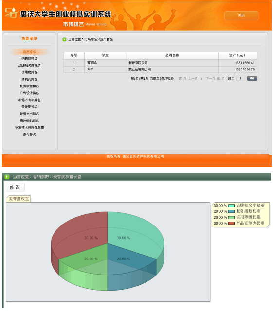 5、系統具有自(zi)動(dong)計(ji)(ji)分和手動(dong)評分功能。自(zi)動(dong)計(ji)(ji)分以各方面排(pai)名(ming)(ming)(ming)(ming)的形式,包(bao)括資金排(pai)名(ming)(ming)(ming)(ming)、銷售排(pai)名(ming)(ming)(ming)(ming)、知名(ming)(ming)(ming)(ming)度(du)排(pai)名(ming)(ming)(ming)(ming)、利潤排(pai)名(ming)(ming)(ming)(ming)、投資收益(yi)排(pai)名(ming)(ming)(ming)(ming)、廣告(gao)(gao)設(she)計(ji)(ji)排(pai)名(ming)(ming)(ming)(ming)、市場(chang)占有率排(pai)名(ming)(ming)(ming)(ming)、美譽(yu)度(du)排(pai)名(ming)(ming)(ming)(ming)、投融資收益(yi)排(pai)名(ming)(ming)(ming)(ming)、累(lei)計(ji)(ji)繳稅排(pai)名(ming)(ming)(ming)(ming)、綜合排(pai)名(ming)(ming)(ming)(ming)等(deng)。教(jiao)師可(ke)以批閱(yue)學(xue)生所提(ti)交(jiao)的計(ji)(ji)劃(hua)書、廣告(gao)(gao)設(she)計(ji)(ji)、市場(chang)調查分析、公司制度(du)等(deng)。