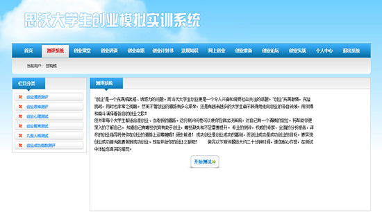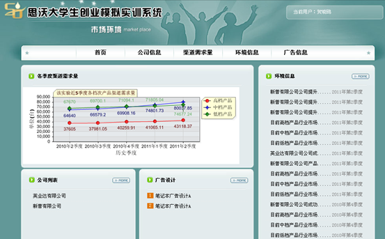 思沃大(da)學(xue)(xue)生(sheng)(sheng)創(chuang)(chuang)(chuang)(chuang)(chuang)(chuang)業(ye)(ye)(ye)模擬(ni)(ni)(ni)實(shi)(shi)(shi)(shi)訓平臺系統(tong)從(cong)大(da)學(xue)(xue)生(sheng)(sheng)創(chuang)(chuang)(chuang)(chuang)(chuang)(chuang)業(ye)(ye)(ye)的(de)(de)(de)現(xian)狀分析,將(jiang)創(chuang)(chuang)(chuang)(chuang)(chuang)(chuang)業(ye)(ye)(ye)教育的(de)(de)(de)內容以及因素滲透在專業(ye)(ye)(ye)實(shi)(shi)(shi)(shi)踐(jian)教學(xue)(xue)中(zhong)(zhong)(zhong),并根據創(chuang)(chuang)(chuang)(chuang)(chuang)(chuang)業(ye)(ye)(ye)教育的(de)(de)(de)目(mu)標及內容設(she)置較完善的(de)(de)(de)創(chuang)(chuang)(chuang)(chuang)(chuang)(chuang)業(ye)(ye)(ye)實(shi)(shi)(shi)(shi)踐(jian)體系。軟件(jian)模擬(ni)(ni)(ni)交互思想,采用(yong)國際先進的(de)(de)(de)計(ji)算機仿真技術(shu),仿真模擬(ni)(ni)(ni)虛(xu)擬(ni)(ni)(ni)市(shi)場環境、市(shi)場調(diao)查(cha)以及整個(ge)(ge)市(shi)場競爭結構。學(xue)(xue)生(sheng)(sheng)通過軟件(jian)學(xue)(xue)習創(chuang)(chuang)(chuang)(chuang)(chuang)(chuang)業(ye)(ye)(ye)心理學(xue)(xue)、創(chuang)(chuang)(chuang)(chuang)(chuang)(chuang)業(ye)(ye)(ye)講堂、網(wang)上創(chuang)(chuang)(chuang)(chuang)(chuang)(chuang)業(ye)(ye)(ye)、創(chuang)(chuang)(chuang)(chuang)(chuang)(chuang)業(ye)(ye)(ye)準備等(deng)創(chuang)(chuang)(chuang)(chuang)(chuang)(chuang)業(ye)(ye)(ye)知識,撰寫一(yi)份創(chuang)(chuang)(chuang)(chuang)(chuang)(chuang)業(ye)(ye)(ye)計(ji)劃書,投入(ru)到創(chuang)(chuang)(chuang)(chuang)(chuang)(chuang)業(ye)(ye)(ye)實(shi)(shi)(shi)(shi)戰(zhan)(zhan)中(zhong)(zhong)(zhong)。創(chuang)(chuang)(chuang)(chuang)(chuang)(chuang)業(ye)(ye)(ye)實(shi)(shi)(shi)(shi)戰(zhan)(zhan)分為(wei)公(gong)司(si)注(zhu)冊和實(shi)(shi)(shi)(shi)戰(zhan)(zhan)運(yun)(yun)營(ying)。公(gong)司(si)注(zhu)冊采用(yong)Flash動畫模式(shi),模擬(ni)(ni)(ni)公(gong)司(si)注(zhu)冊的(de)(de)(de)整個(ge)(ge)流程。實(shi)(shi)(shi)(shi)戰(zhan)(zhan)運(yun)(yun)營(ying)是(shi)整個(ge)(ge)系統(tong)的(de)(de)(de)主體,將(jiang)全國分為(wei)七個(ge)(ge)區域:東北地(di)(di)(di)區、華(hua)(hua)北地(di)(di)(di)區、西(xi)北地(di)(di)(di)區、華(hua)(hua)東地(di)(di)(di)區、西(xi)南(nan)地(di)(di)(di)區、華(hua)(hua)中(zhong)(zhong)(zhong)地(di)(di)(di)區、華(hua)(hua)南(nan)地(di)(di)(di)區。系統(tong)模擬(ni)(ni)(ni)公(gong)司(si)內部與(yu)外(wai)在市(shi)場之間(jian)的(de)(de)(de)矛(mao)盾(dun),創(chuang)(chuang)(chuang)(chuang)(chuang)(chuang)業(ye)(ye)(ye)者通過各(ge)種調(diao)查(cha)、決策解(jie)決企業(ye)(ye)(ye)市(shi)場運(yun)(yun)營(ying)過程中(zhong)(zhong)(zhong)可能(neng)遇(yu)到的(de)(de)(de)各(ge)種情況。在區域需求飽和后擴大(da)市(shi)場,對(dui)其中(zhong)(zhong)(zhong)出現(xian)的(de)(de)(de)問題和運(yun)(yun)營(ying)結果進行分析與(yu)評估,培養(yang)大(da)學(xue)(xue)生(sheng)(sheng)正(zheng)確的(de)(de)(de)人生(sheng)(sheng)觀(guan)(guan)、價值(zhi)觀(guan)(guan)、就業(ye)(ye)(ye)觀(guan)(guan),提(ti)高大(da)學(xue)(xue)生(sheng)(sheng)勇于(yu)創(chuang)(chuang)(chuang)(chuang)(chuang)(chuang)業(ye)(ye)(ye)的(de)(de)(de)精神,讓(rang)大(da)學(xue)(xue)生(sheng)(sheng)有(you)良好的(de)(de)(de)創(chuang)(chuang)(chuang)(chuang)(chuang)(chuang)業(ye)(ye)(ye)意識,增強大(da)學(xue)(xue)生(sheng)(sheng)自主創(chuang)(chuang)(chuang)(chuang)(chuang)(chuang)業(ye)(ye)(ye)能(neng)力。