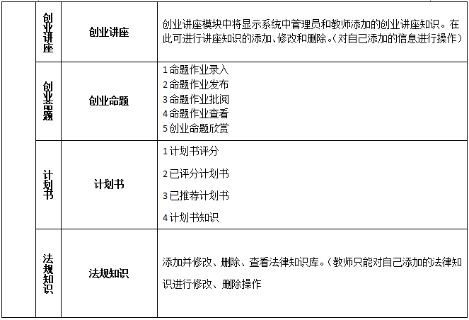 2、包含(han)創(chuang)(chuang)業(ye)(ye)(ye)理論知(zhi)識的(de)學習和創(chuang)(chuang)業(ye)(ye)(ye)實戰訓練。創(chuang)(chuang)業(ye)(ye)(ye)理論知(zhi)識包括測(ce)評系統(tong)、創(chuang)(chuang)業(ye)(ye)(ye)課堂、創(chuang)(chuang)業(ye)(ye)(ye)講(jiang)談、創(chuang)(chuang)業(ye)(ye)(ye)命題、創(chuang)(chuang)業(ye)(ye)(ye)計劃(hua)(hua)書、法(fa)規知(zhi)識、網上創(chuang)(chuang)業(ye)(ye)(ye)、創(chuang)(chuang)業(ye)(ye)(ye)準備、創(chuang)(chuang)業(ye)(ye)(ye)論壇。創(chuang)(chuang)業(ye)(ye)(ye)實戰訓練包含(han)選擇行業(ye)(ye)(ye)、注冊公司、人員招聘(pin)、產(chan)品戰略策劃(hua)(hua)、產(chan)品生產(chan)、渠道銷(xiao)售(shou)、促(cu)銷(xiao)、備貨運(yun)送等(deng)內(nei)容。